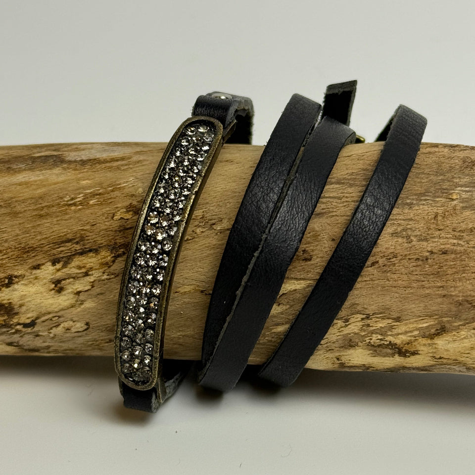 Crystal ID leather wrap bracelet. Antique brass finish with black diamond crystals. Genuine Italian leather. Handcrafted in Brooklyn.