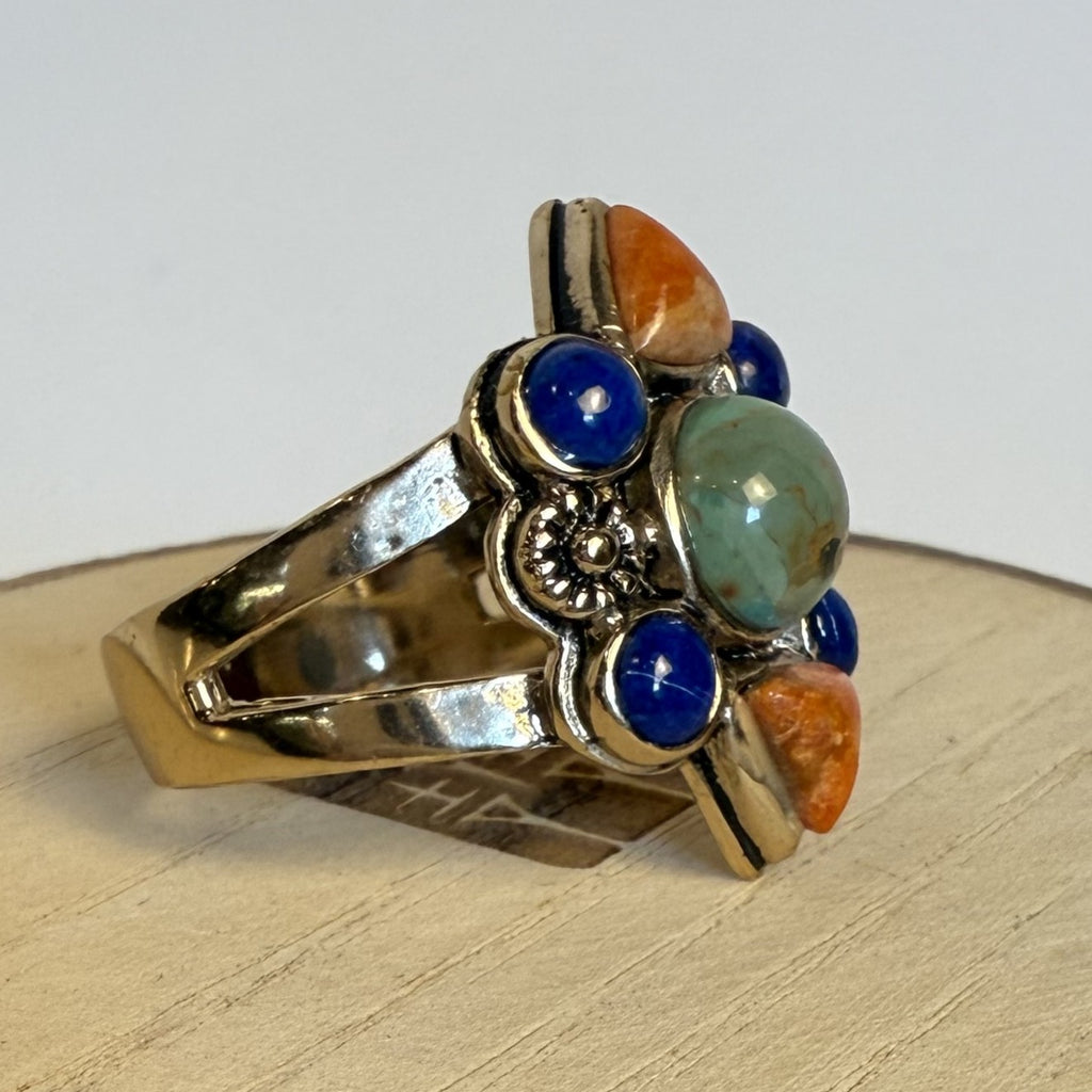 Discover this uniquely beautiful statement ring made with genuine bronze, turquoise, lapis and sponge coral. Top of ring is .75" at widest point. The intricate cast floral designs are adorned with multi-colored stones, all of which come together to form a stunning open shank design for maximum comfort! Let this vibrant ring add the perfect touch of style to any look.