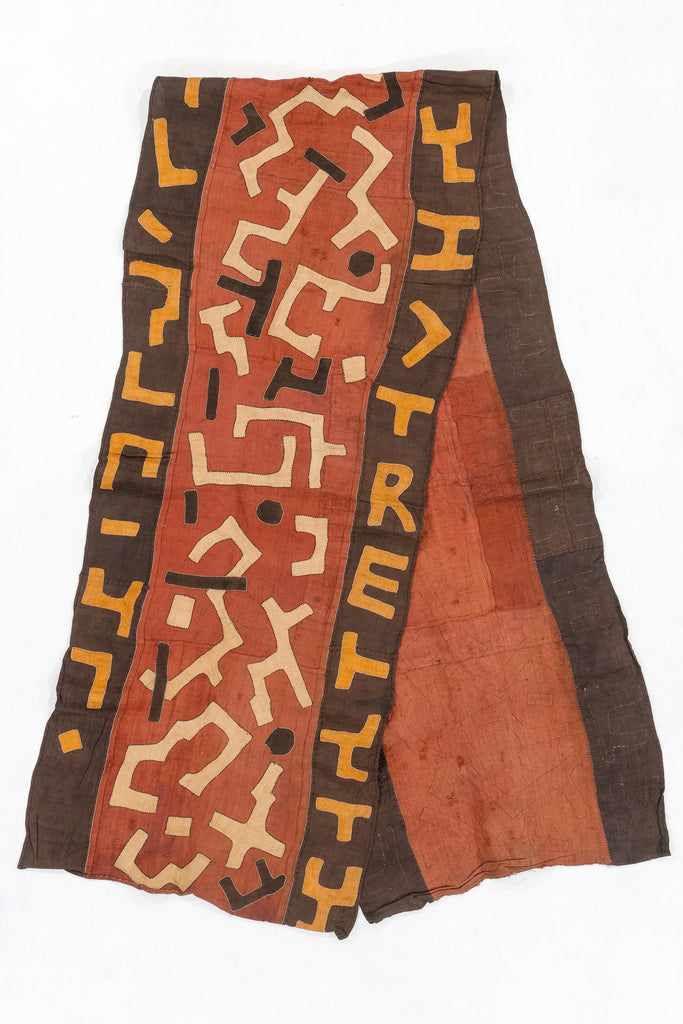 This striking, one-of-a-kind Kuba cloth is entirely handmade using traditional techniques of the Kuba people. Woven from raffia palm fibers and dyed with natural materials, the textile is then hand-appliquéd with bold geometric designs.