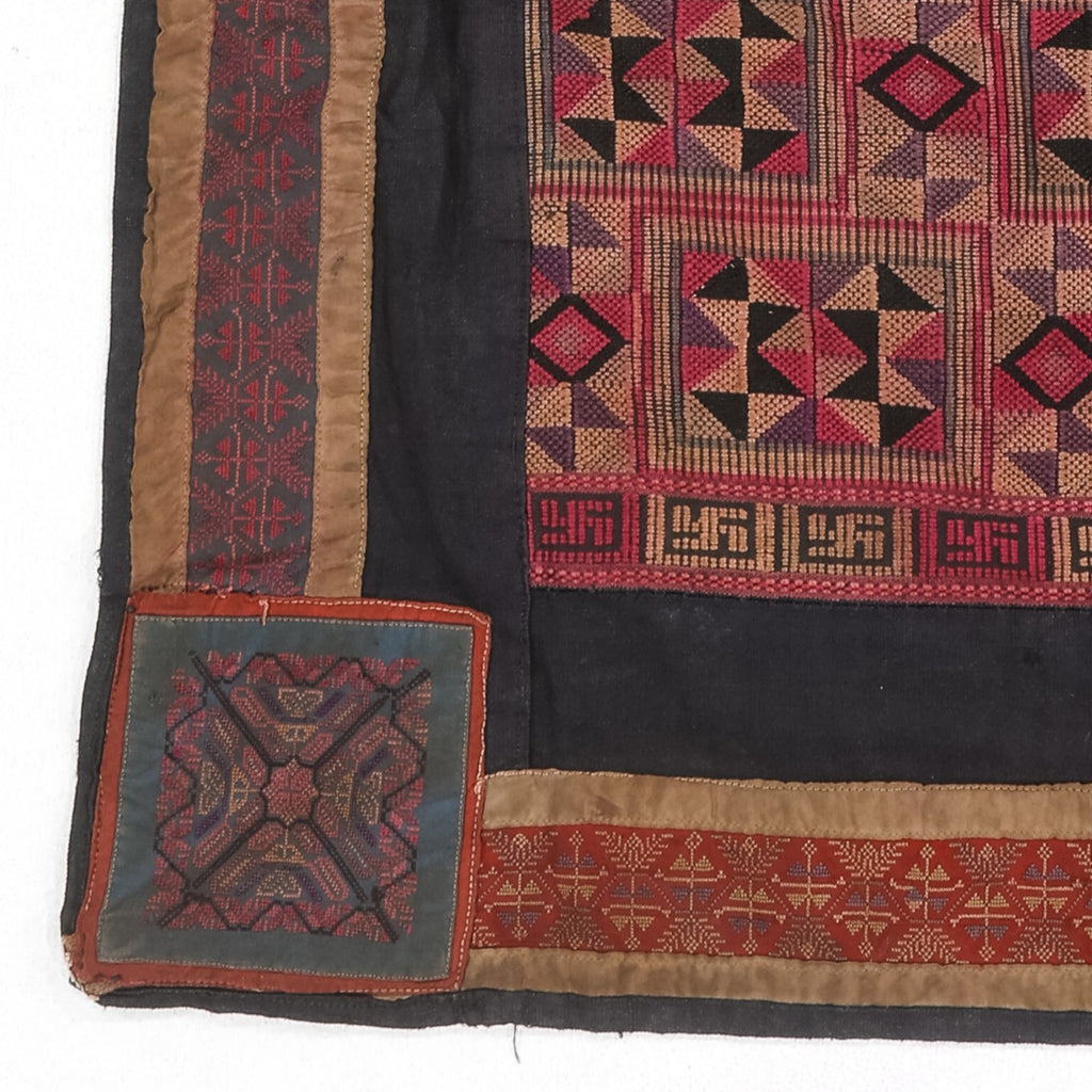 This hand-embroidered baby carrier was made by the Miao people of southwestern China. Unlike many carriers, it does not have straps; instead, it consists of a square textile with a narrower rectangular extension sewn to one side—likely intended as a head covering for the baby. Both sections are intricately embroidered with fine traditional designs, reflecting the exceptional craftsmanship of the Miao artisans.