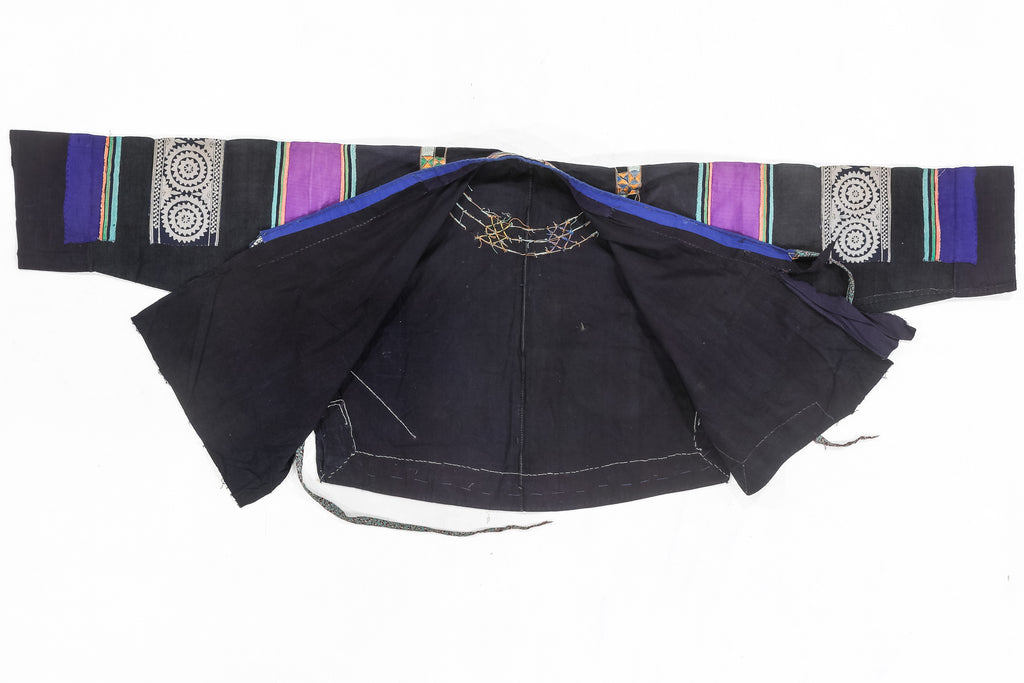 A beautifully crafted traditional piece made from indigo-dyed batik cotton, richly embellished with silk embroidery and appliqué work. This garment showcases the artistry and cultural heritage of the Miao people.